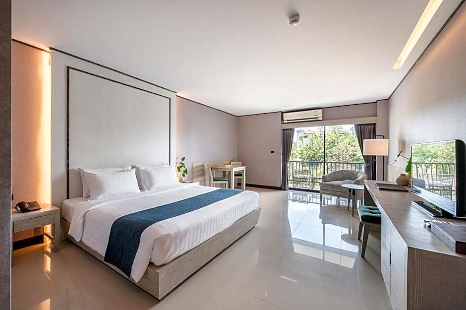 Deluxe With Balcony is 463 square feet and includes either a king-size bed 150-183 width or 2 single beds 80-130 width plus a sofa bed plus balcony, terrace, extra beds on demand, desk, cable tv, hairdryer, tea and coffee making facilities , ironing set, safe, bathrobes, and slippers.